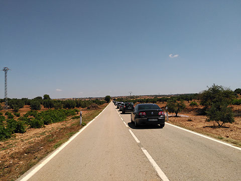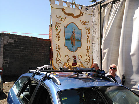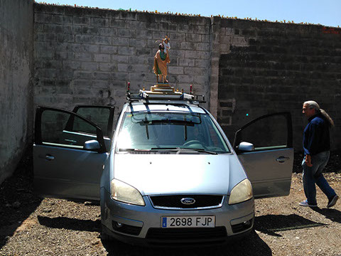 Finalizada la misa se realiza la procesión en coche por el recorrido habitual (10 km) haciendo unas paradas programadas para refrescar y tomar un aperitivo.